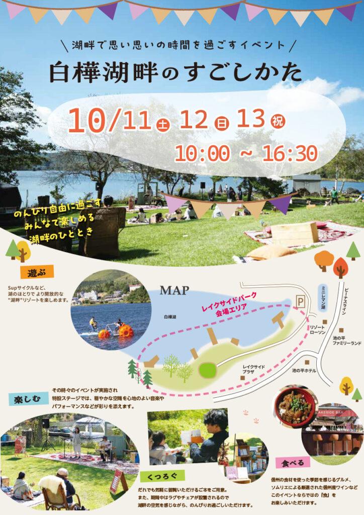 「白樺リゾートレイクサイドパーク」で開催されるイベントです。会場内に設置される特設ステージでは、アコースティック中心のライブ演奏。誰でも読める本、ラグやチェア、そして焚き火が用意されます。信州牛の鉄板焼きやキノコのアヒージョなどのグルメも。体を動かしたい方はSupサイクルなどのアクティビティが体験できます。紅葉が進む高原の澄んだ空気の中で、のんびりと自由に過ごしてみてはいかがでしょうか。